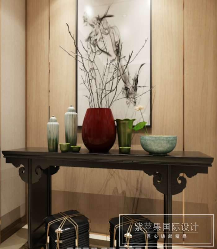 主人對于風(fēng)水頗有講究,自身五行屬土,所以我們在設(shè)計(jì)時家居整體色彩上以大地色系為主。梨花木色的門配以局部的原木色的墻飾將低調(diào)、儒雅慢慢呈現(xiàn)。加上富有細(xì)節(jié)的條案、餐椅將新中式的文化氣息得到升華。整體有如一幅山水畫,值得人慢慢品味,經(jīng)久不衰。又如一碗茶,一口清淡,再品醇厚,齒頰留香。