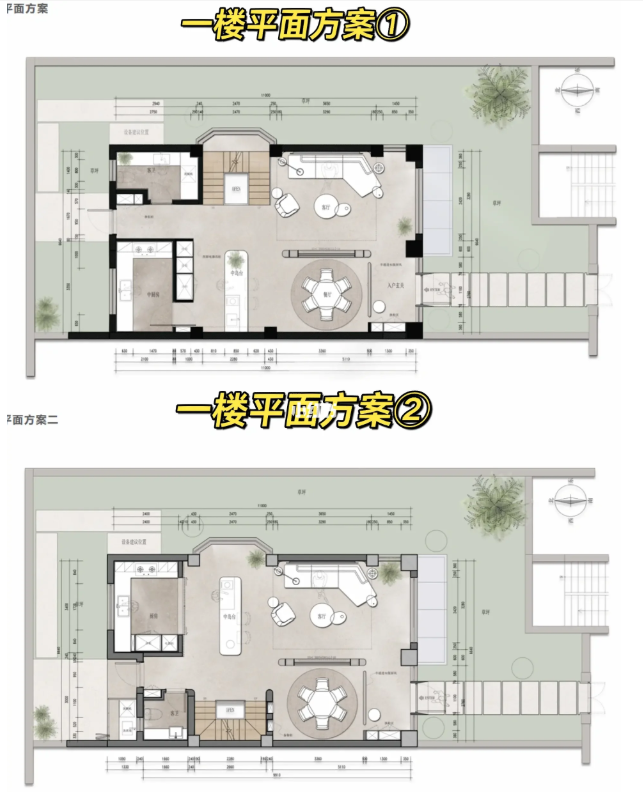 1F:入戶做了一個(gè)具有儀式感的門廳,朝南做了一個(gè)下沉式客廳,樓梯改成了U型樓梯,外拓?cái)U(kuò)大了原來(lái)的廚房面積分為中西結(jié)合的廚房,