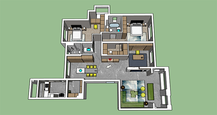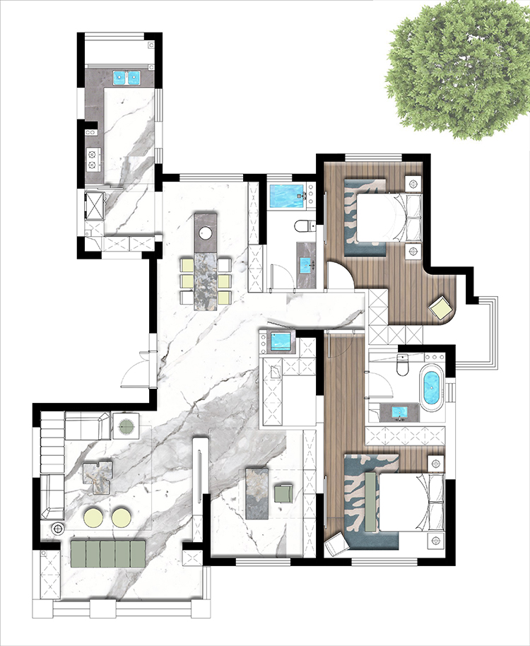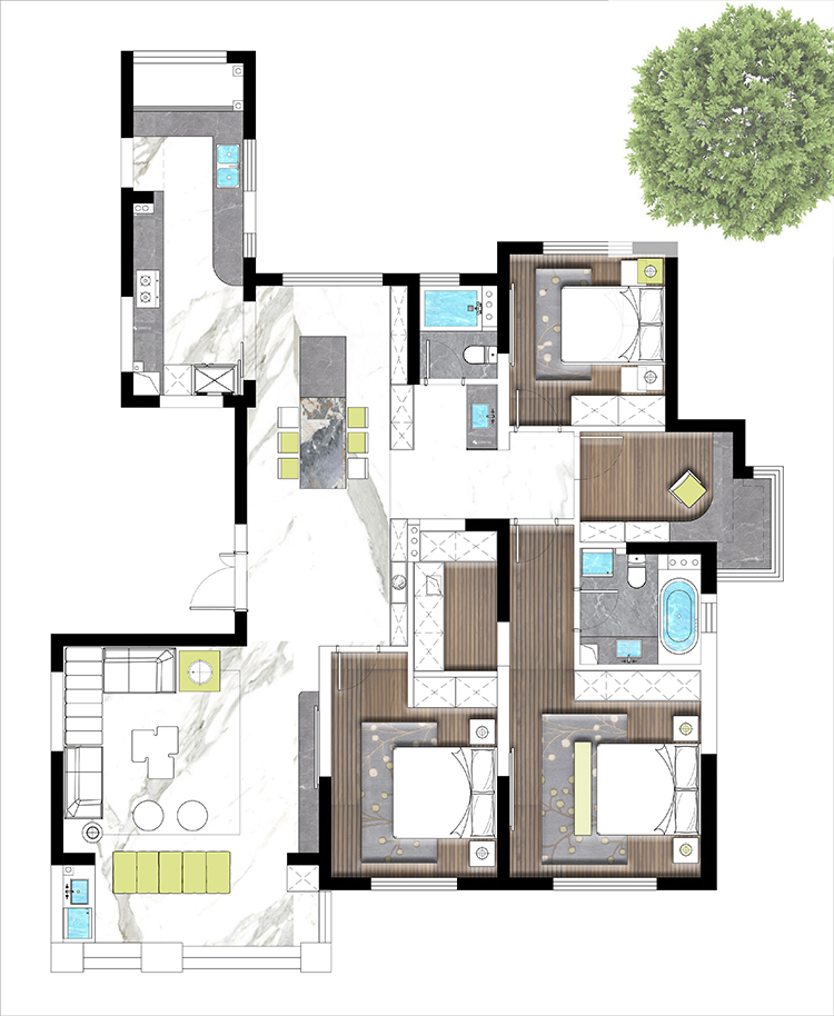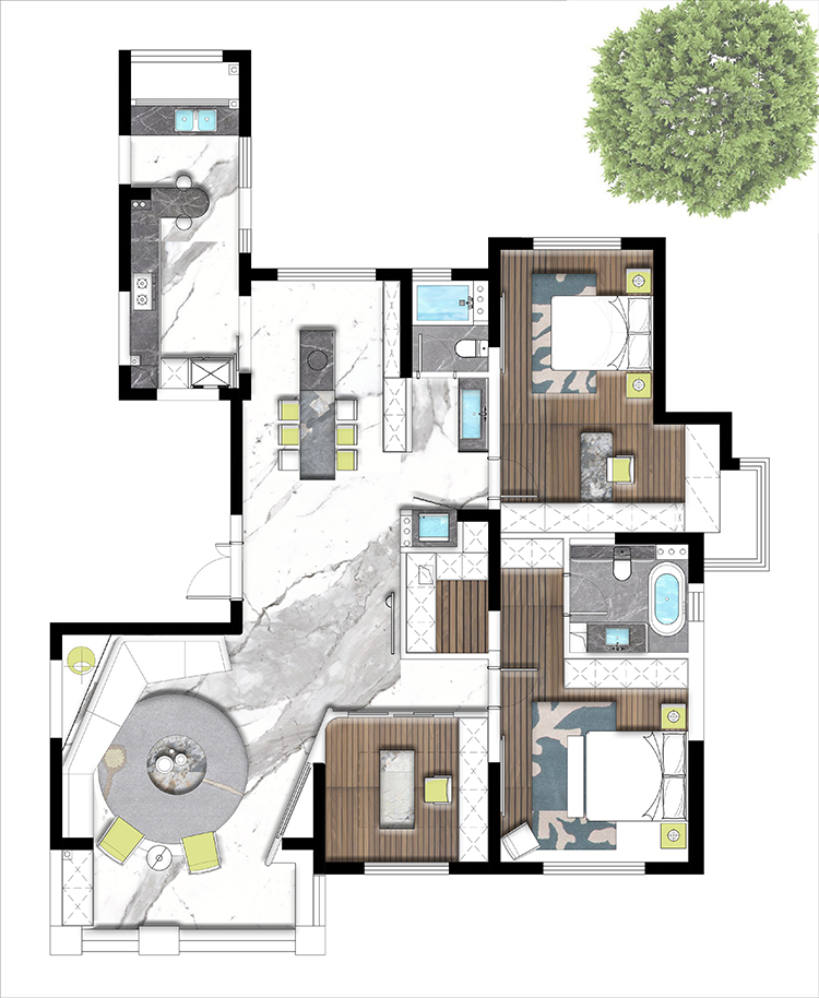 方案二也是設(shè)計(jì)師主推的一套方案,進(jìn)門一個(gè)玄關(guān),整體空間往南面移了一點(diǎn),由于承重結(jié)構(gòu)進(jìn)入客廳的過(guò)道永遠(yuǎn)打不開,是大平層的空間感提現(xiàn)不出來(lái),所以我們?cè)O(shè)計(jì)師如圖拉了一個(gè)平行的造型,追大程度打開這塊空間,然后其他兩塊區(qū)域也劃分明了,大人小孩互不干擾,書房也設(shè)置在南面,整體視野非常開闊,可以看到蠡湖風(fēng)景。客戶也很此套方案。方案三也比較常規(guī)
