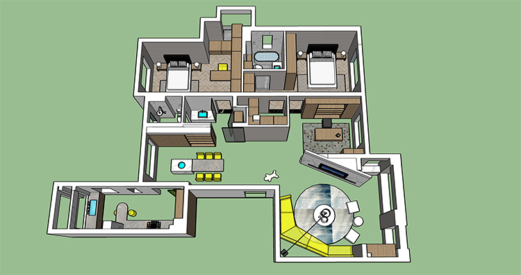 方案一比較常規(guī),進(jìn)門開放處理,做了一個(gè)玄關(guān),兩個(gè)房間朝南,餐廳旁邊做了一個(gè)玻璃移門,平時(shí)可以關(guān)起來(lái)!