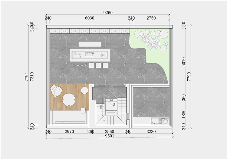 一樓后期方案里的樓梯也很有意思,把一部分空間給到了衛(wèi)生間,這樣會大一點,設置了一個老人房。