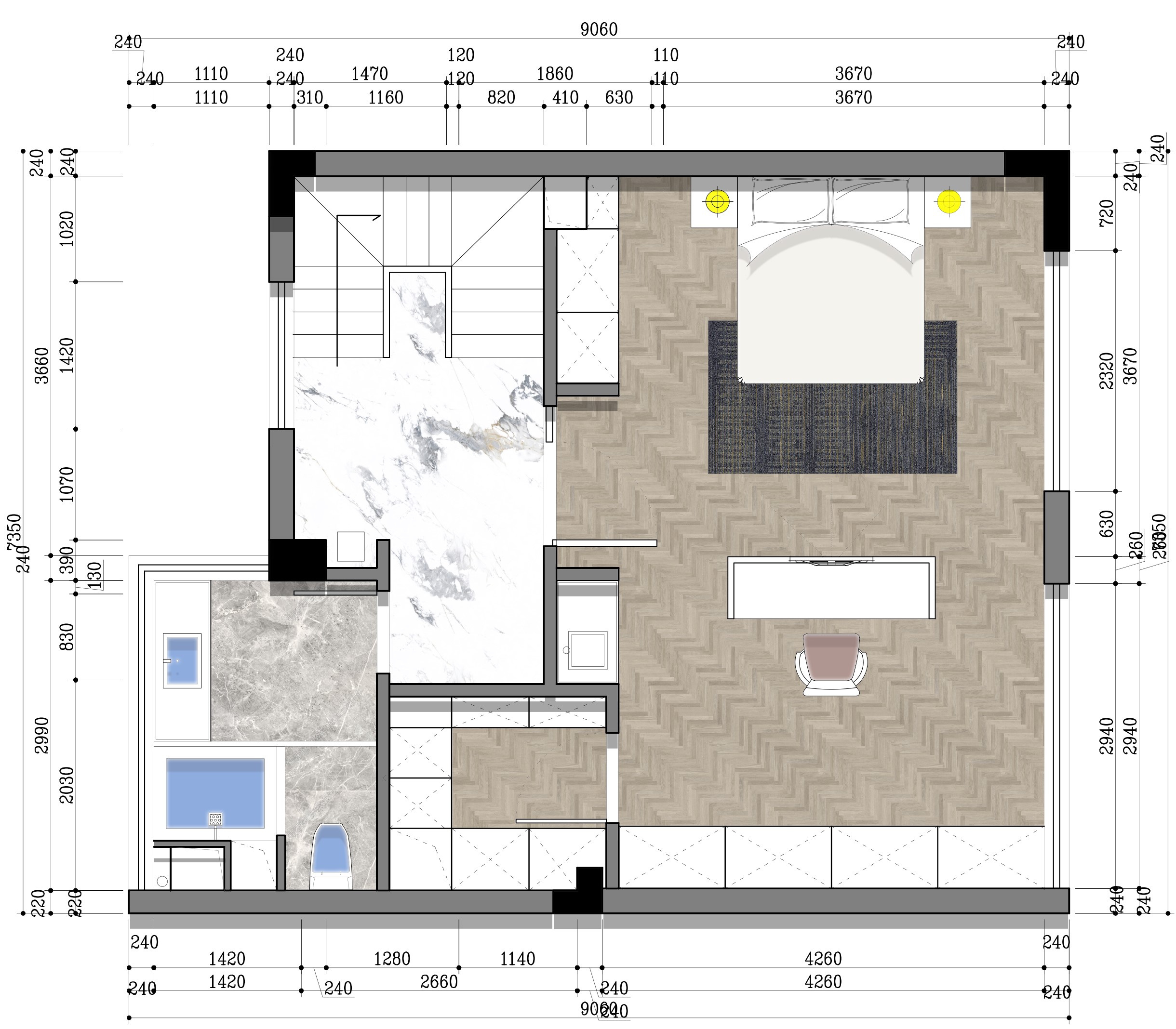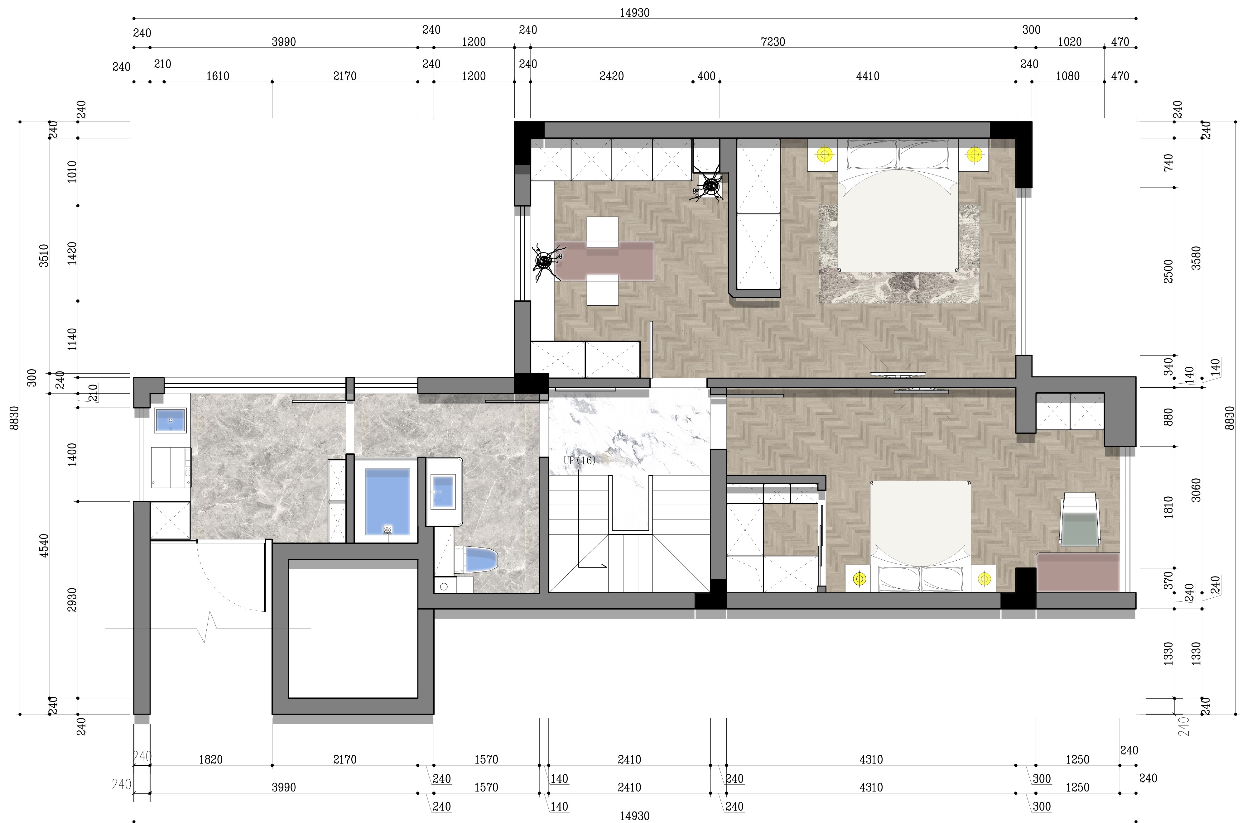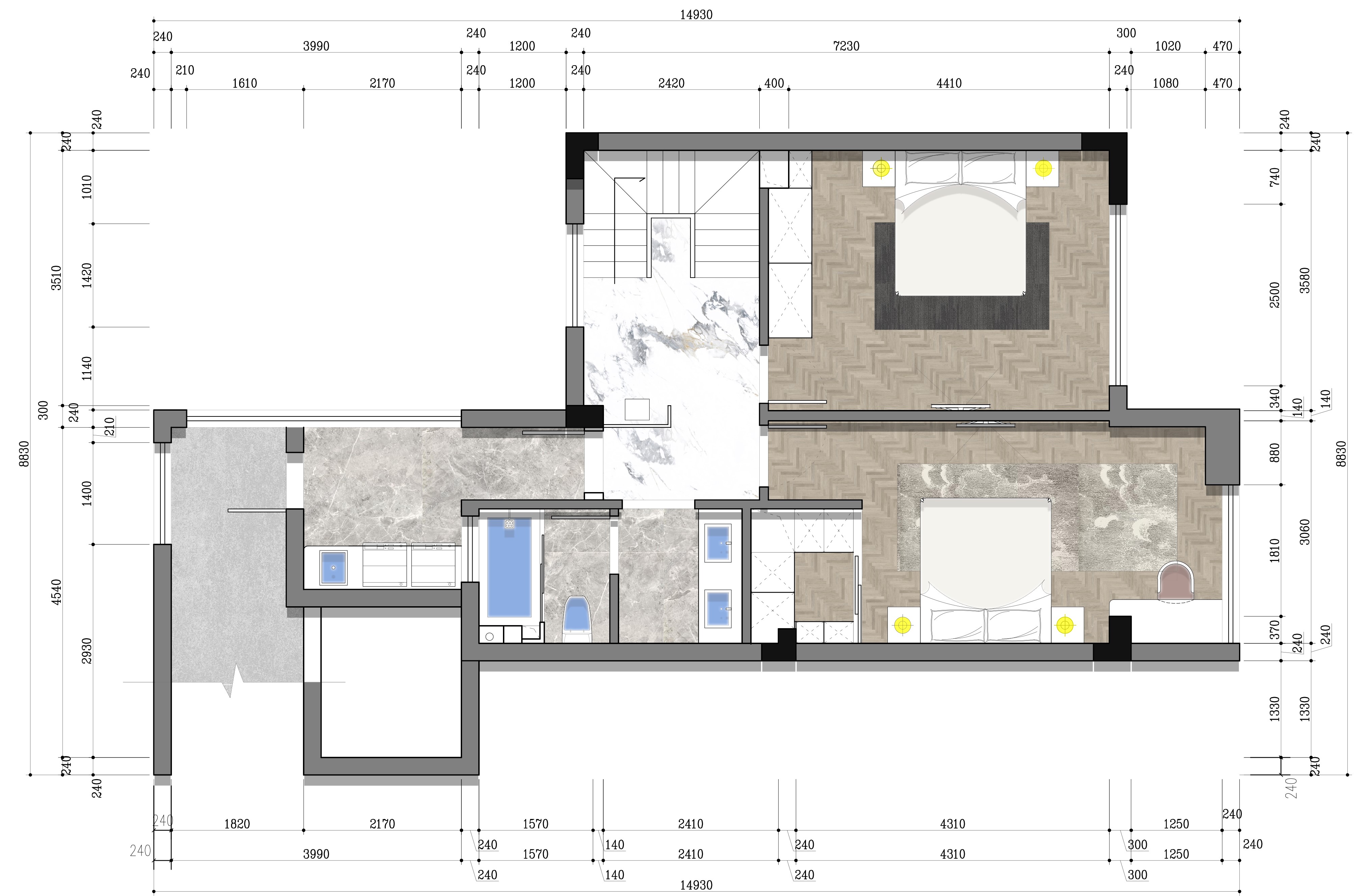 二樓如果不能外拓的話此戶型比較雞肋,若果外拓之后,品質(zhì)提升,朝南主臥大套房,獨立衣帽間。三樓我們現(xiàn)澆之后做了一個大主臥,外面做了個書房,方便辦公使用!