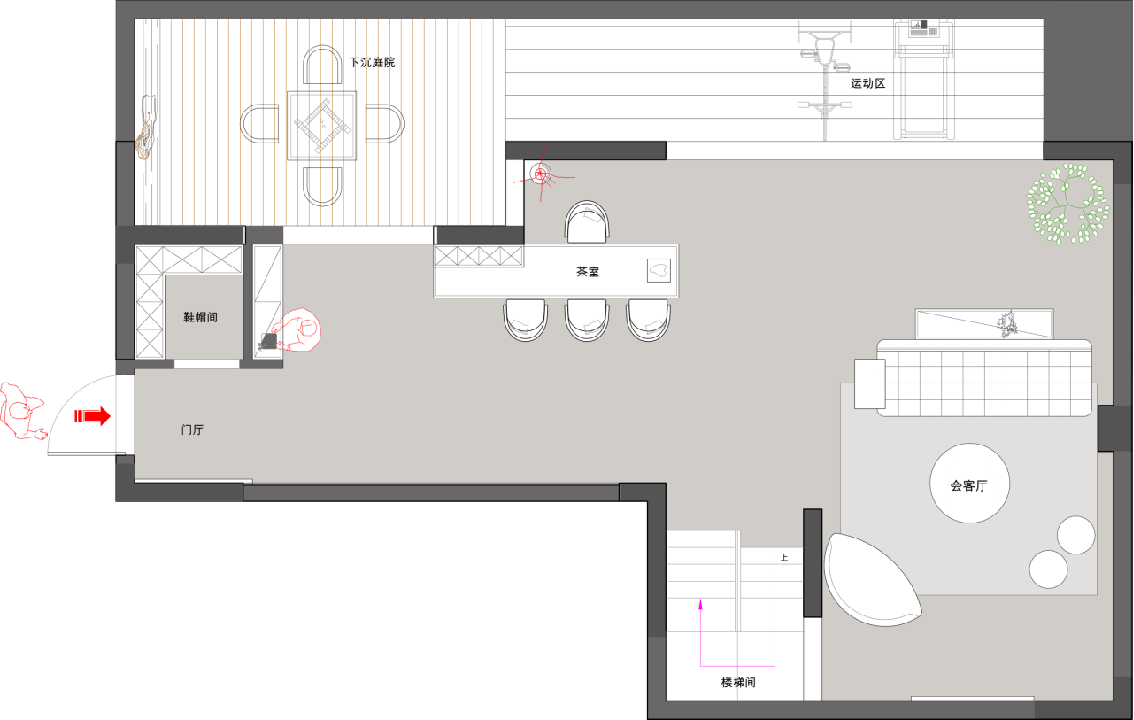 1?地下室負二層,我們做的是一個下沉式庭院,解決了地下采光的問題,下面功能主要是會客休閑,健身區(qū)域,入戶做了一個獨立的鞋帽間。