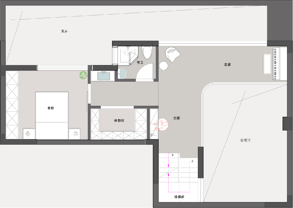 2?負一樓夾層保留了挑空區(qū)域,一部分用于儲藏空間,其他是客臥客衛(wèi)。