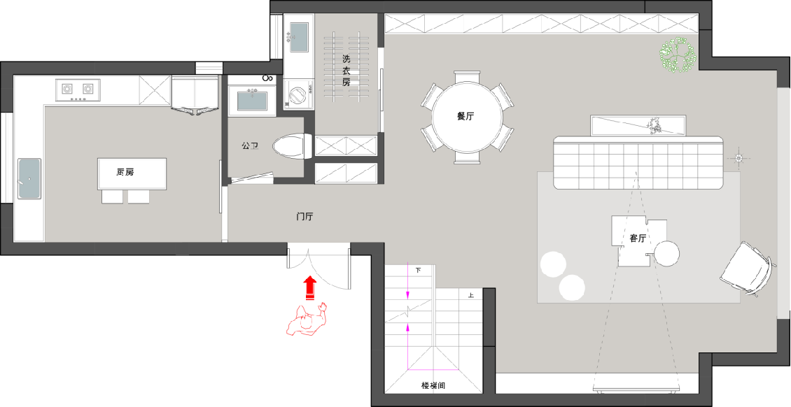 3?一樓規(guī)劃也是很合理,客餐廳一體的大空間,南面一小塊做了單獨的洗衣晾曬區(qū)。