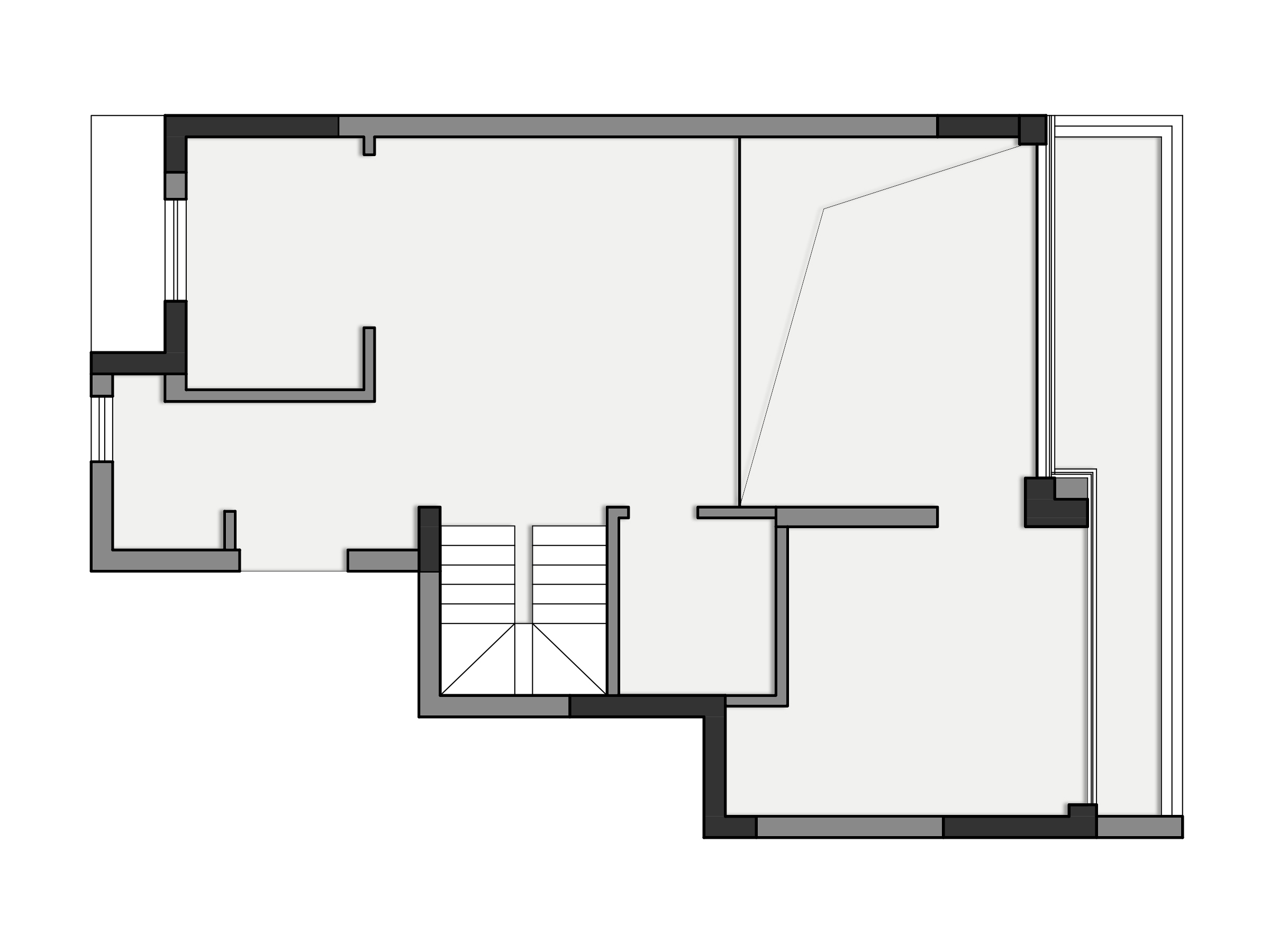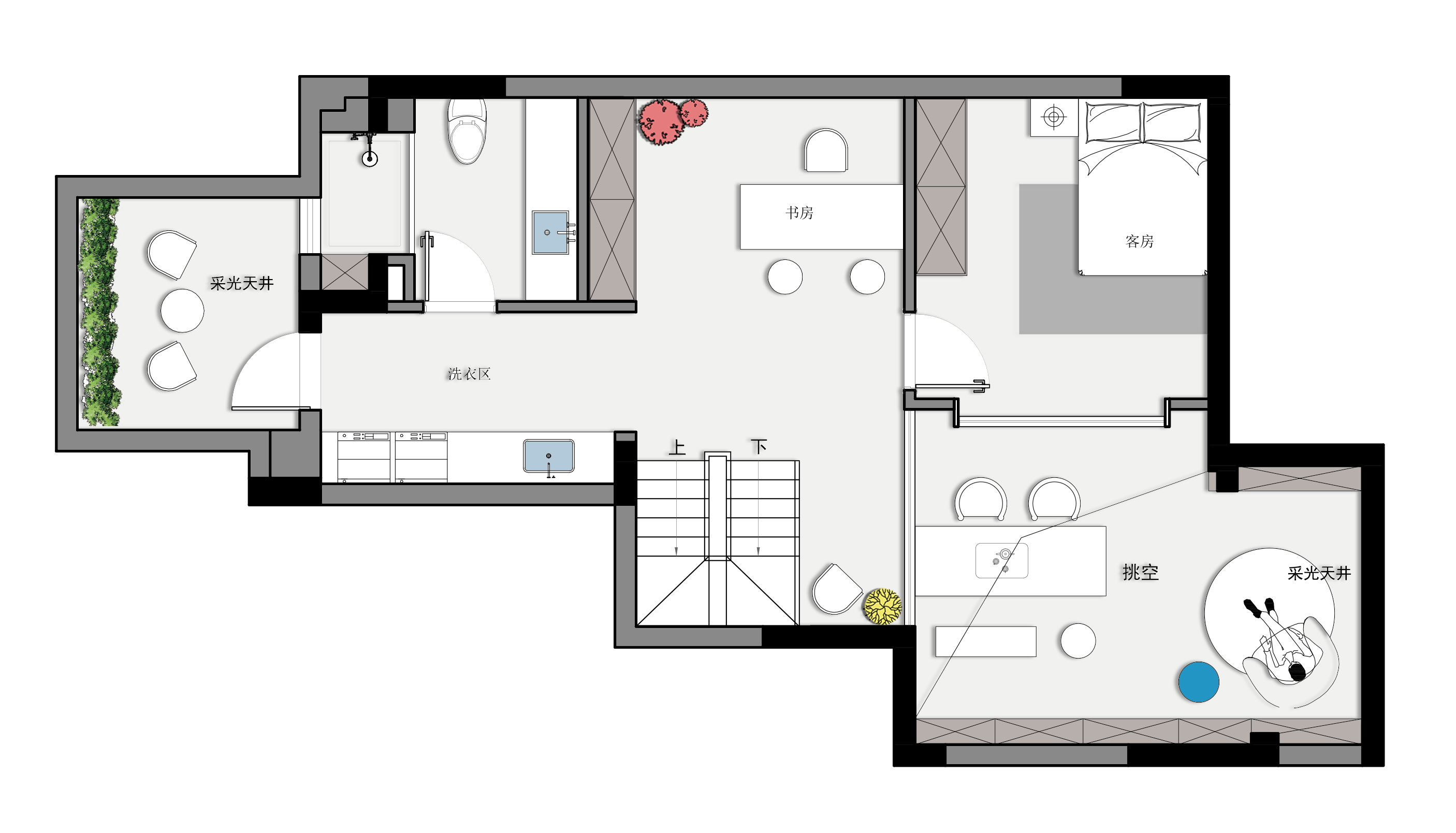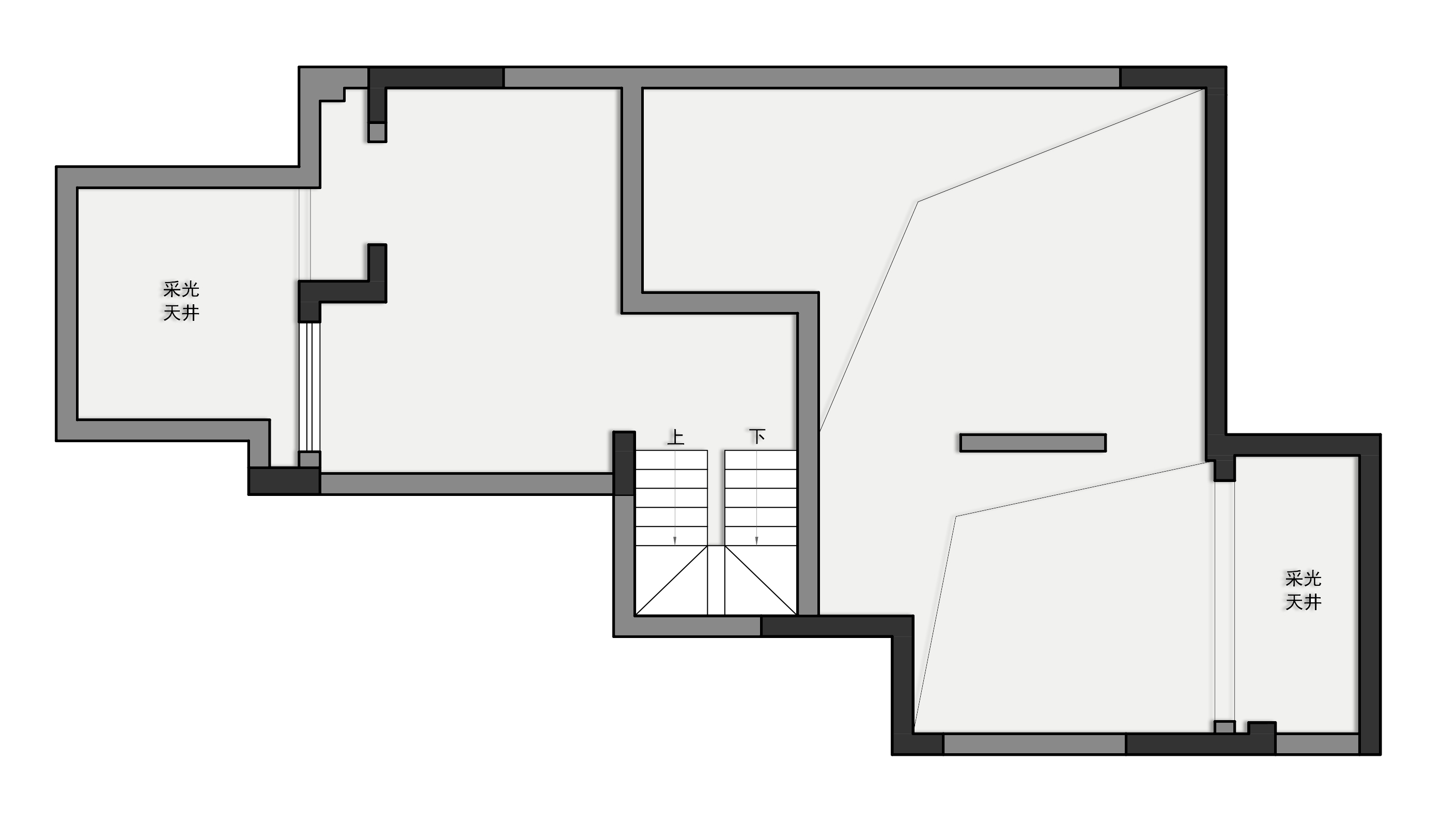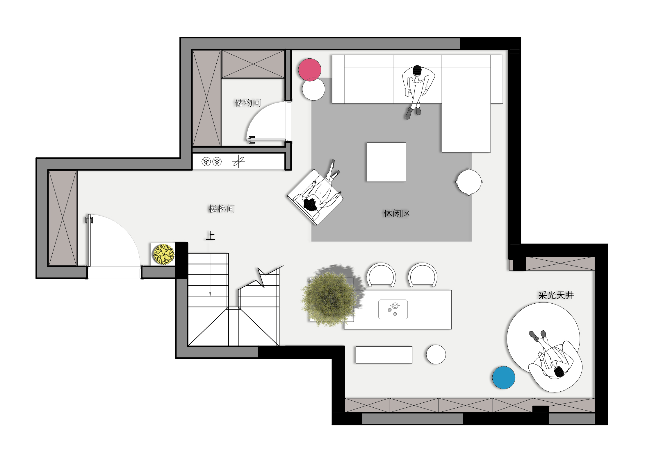 3?負(fù)一層保留了大挑空,結(jié)合少量現(xiàn)澆,把空間變得更方正,利用率更高。將北面采光井也納入室內(nèi)規(guī)劃范圍,難處理的Z字形承重柱用柜子做裝飾,滿足了儲(chǔ)物需求,空間也更加美觀。這個(gè)空間主要作為多功能的書房和儲(chǔ)物間來使用,滿足客戶工作、