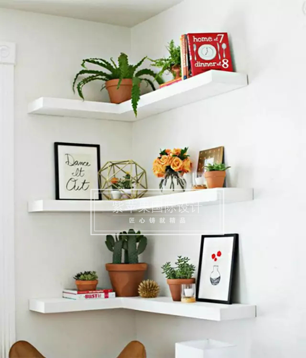 像上圖這樣安裝幾層轉(zhuǎn)交式的置物架是個(gè)不錯(cuò)的主意。簡(jiǎn)單放上鮮花綠植、畫作和小裝飾就已經(jīng)很漂亮,當(dāng)然,你還可以用來放書,或者漂亮的餐具。不過在放的時(shí)候一定要考慮到置物架的承重能力,以免發(fā)生意外。