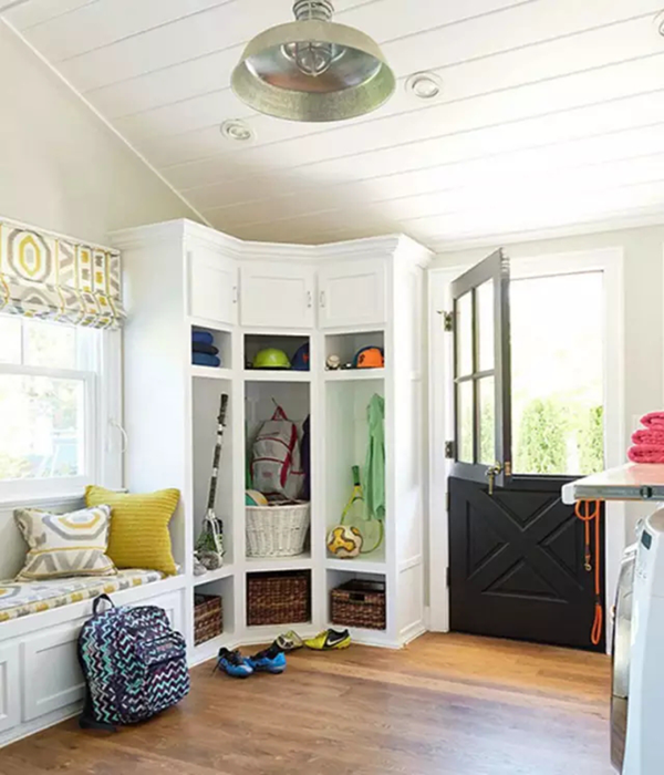 臥室或者是玄關(guān)附近位置的尷尬角落,放一個(gè)轉(zhuǎn)角式的置物柜會(huì)是個(gè)不錯(cuò)的做法。安裝在入門位置的話,運(yùn)動(dòng)用品、健身背包、書包、遛狗繩之類的,可以全部都集中在這個(gè)位置,干凈整齊。至于臥室里,則是衣柜的延伸,但只適合家里面積比較大,看起來有點(diǎn)空蕩蕩的家庭。