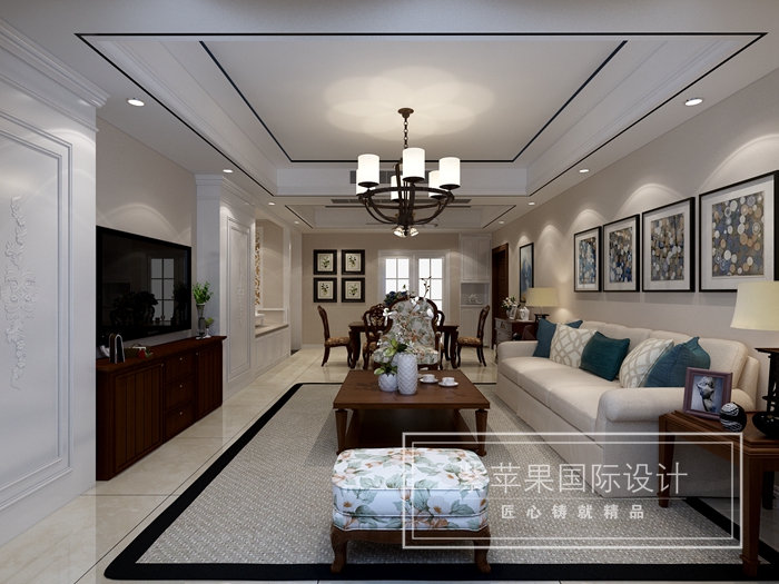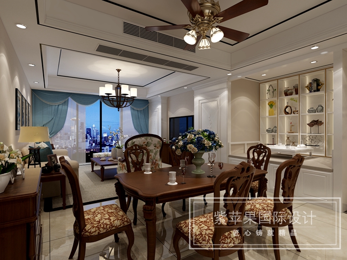 客餐廳:在甲方要求必須將現(xiàn)有家具使用的情況下,本案設(shè)計(jì)師巧妙運(yùn)用多層次吊頂把客餐廳空間區(qū)分明確,墻面大面積采用乳膠漆調(diào)色淡化過渡深色家具,輔以大面積白色底色,用青檸色流行色點(diǎn)綴加入流行的淡雅氣息,在電視背景巧妙的運(yùn)用了西式對稱造型隱藏了主臥房門,充滿了復(fù)古雅致。